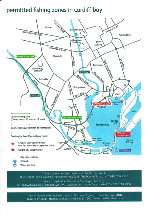 Cardiff Bay is located near Cardiff Docks. See the map for the designated fishing areas.