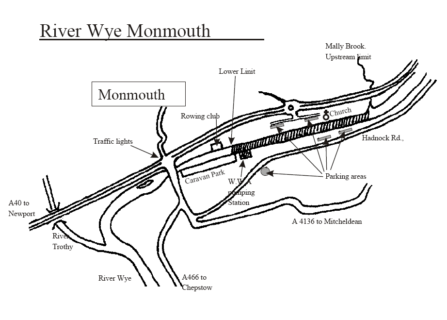The Clubs stretch of the Wye is double bank from Monmouth Rowing Club, upstream to Malley Brook on the Dixton bank. Access to the West Bank is generally from Dixton Church where car parking is available, wjile access to the East Bank is along Hadnock Road, where there are occasional car parking spaces. There are accessible pegs on both banks, but please be very careful as the banks can be slippery and the water can be deep in the margins.