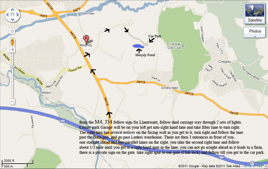 From the M4 J34 follow sign for Llantrisant, follow dual carriage way through 2 sets of lights. Corner park Garage will be on your left get into right hand lane and take filter lane to turn right. The right turn has several notices on the facing wall as you get to it, turn right and follow the lane past the Barn pub, and go past Leekes warehouse. There are then 3 entrances in front of you, one staright ahead and two parallel lanes on the right, you take the second right lane and follow about 1/2 mile until you get to a right hand spur in the lane, you can not go sraight ahead as it leads to a farm, there is a private sign on the gate. take right spur to our gate (Club lock) and follow till you get to the car park. |